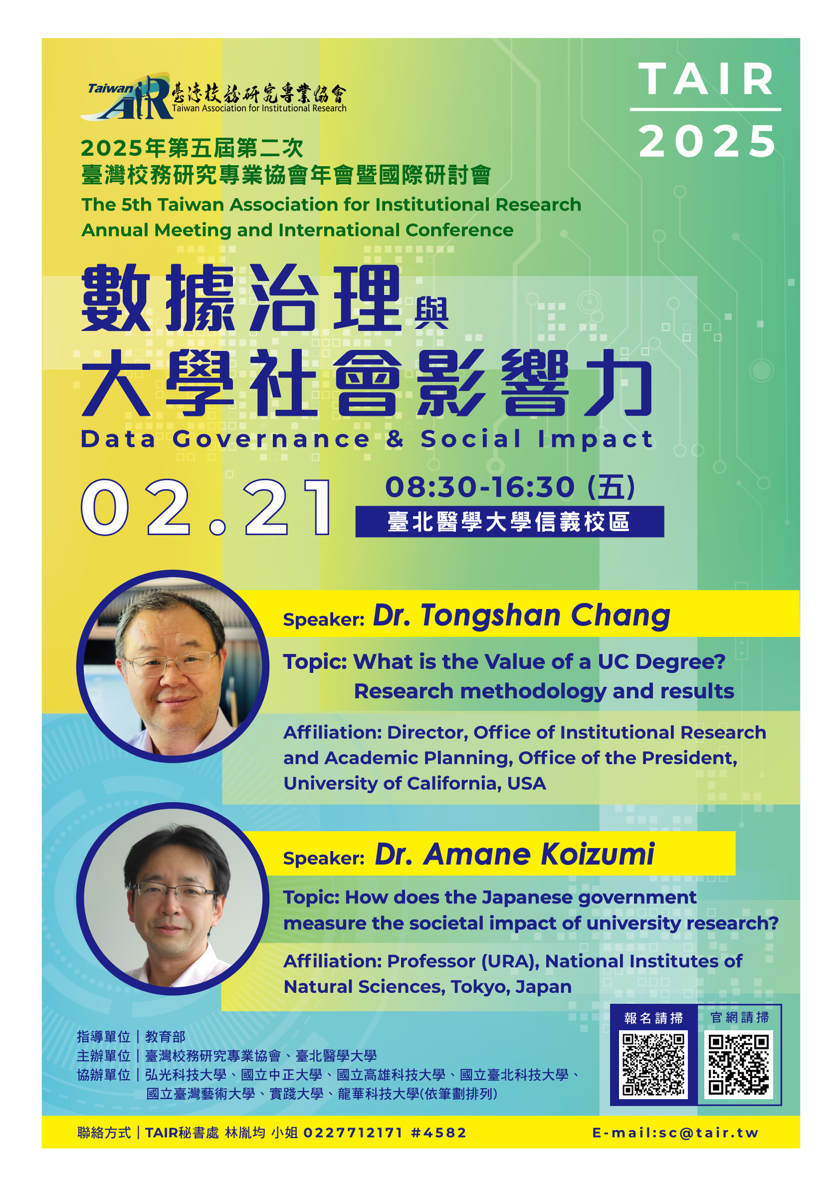 一、本會(臺灣校務研究專業協會)訂於2025年2月21日假臺北醫學大學信義校區醫學綜合大樓前棟4樓誠樸廳辦理第五屆第二次臺灣校務研究專業協會年會暨國際研討會,本次會議主題為數據治理與大學社會影響力,邀請加州大學系統總校長辦公室以及日本國家自然研究院主管專題演講介紹美國與日本如何從數據反映大學的社會影響力。