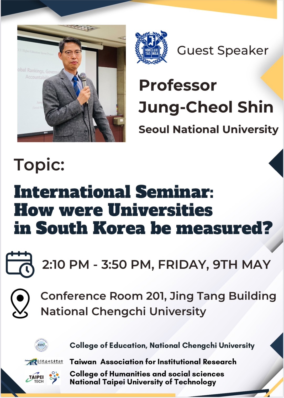 一、為深入探討大學績效評估與高等教育改革趨勢,臺灣校務研究專業協會與國立政治大學教育學院共同舉辦主題講座,邀請韓國首爾大學Shin Jung Cheol教授,分享南韓政府於高等教育改革與大學評價策略之實務經驗。(海報)